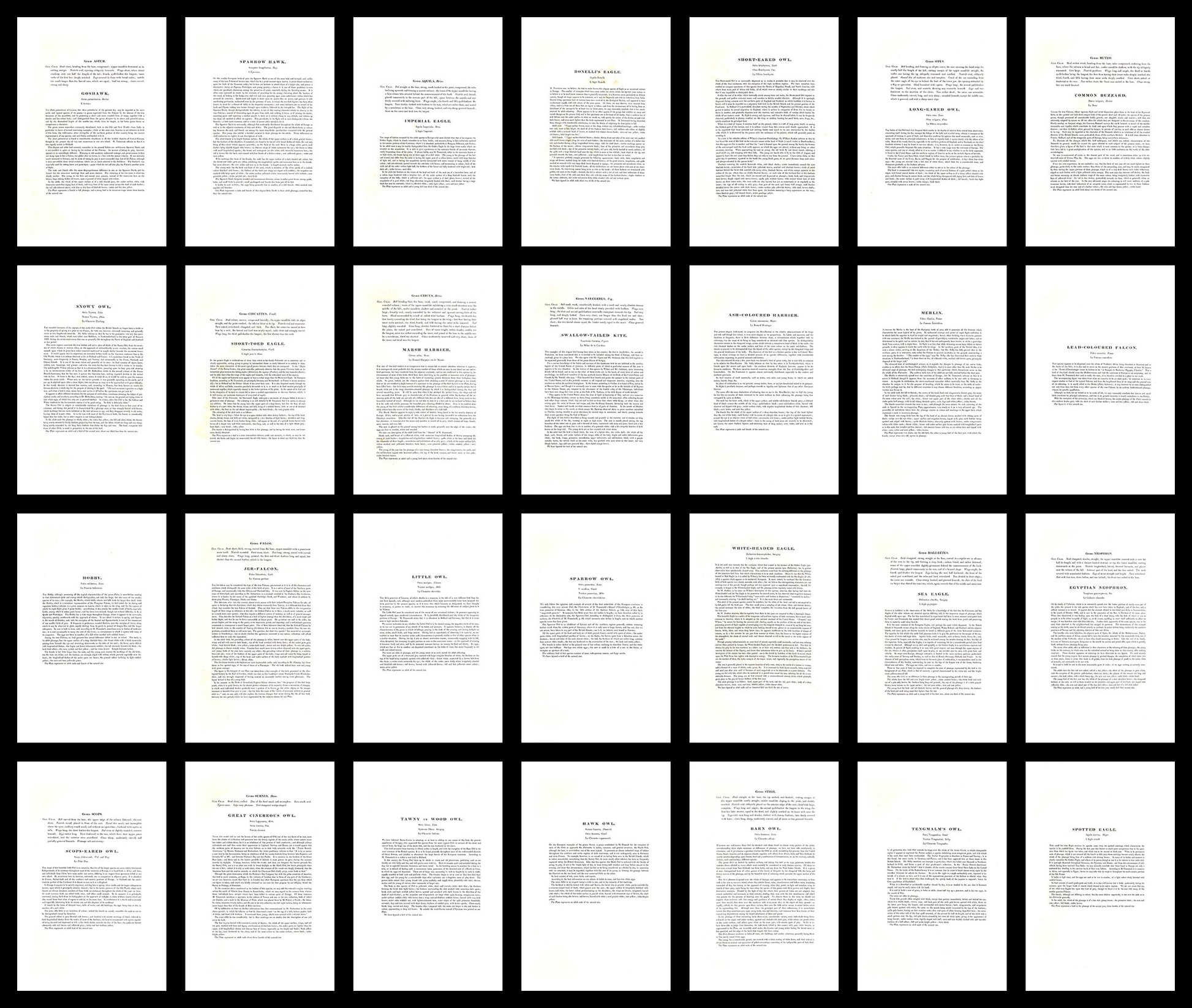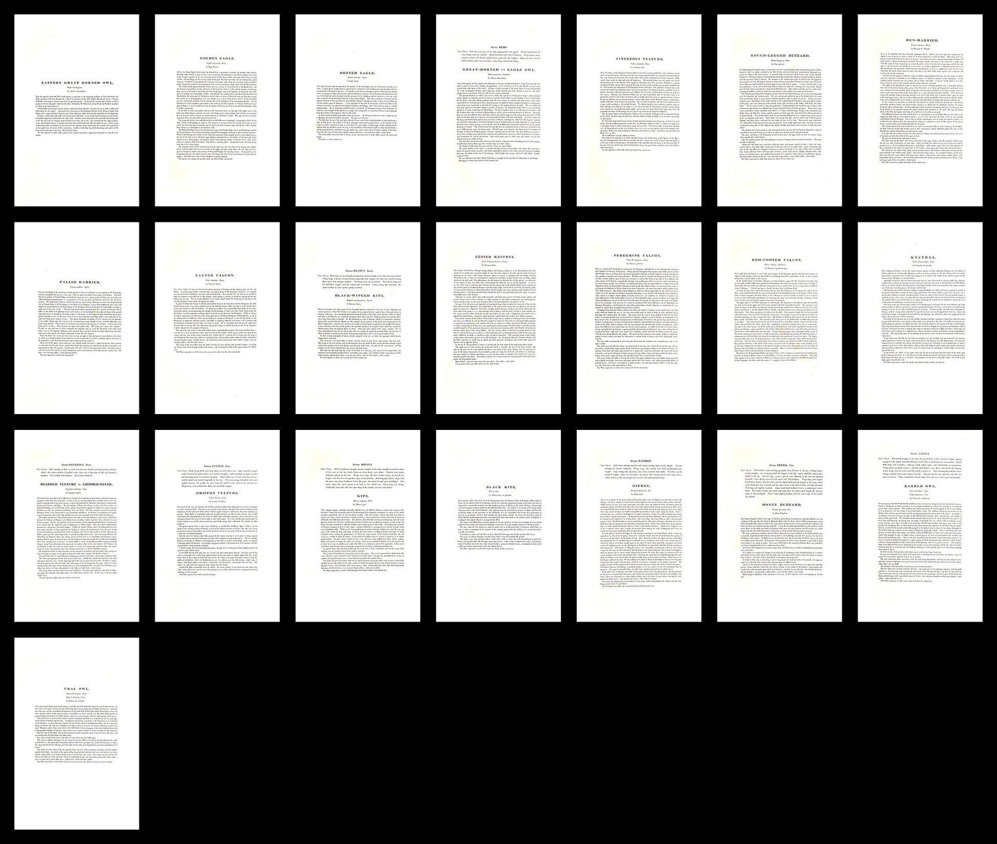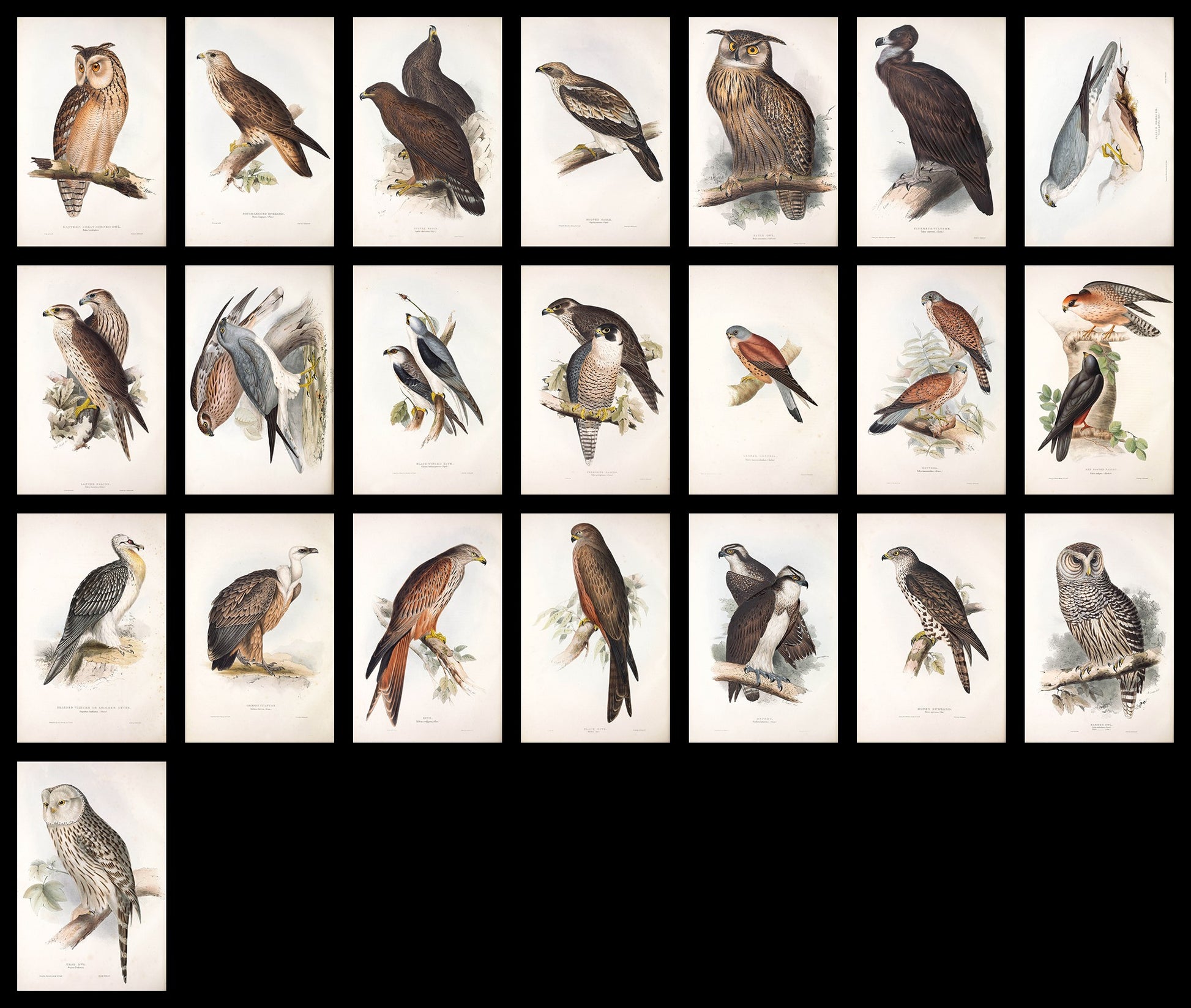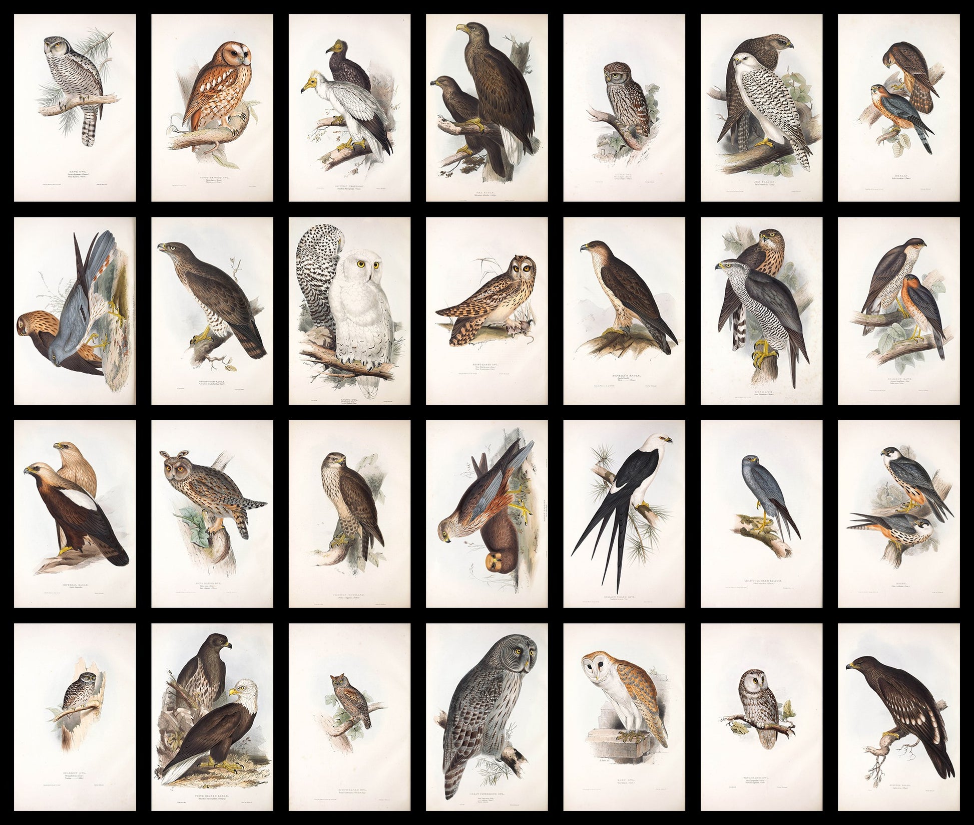 the 50 birds in vol. 1 mainly consist of eagles, vultures, owls and other birds of prey, below you can see a complete list of the 50 birds: