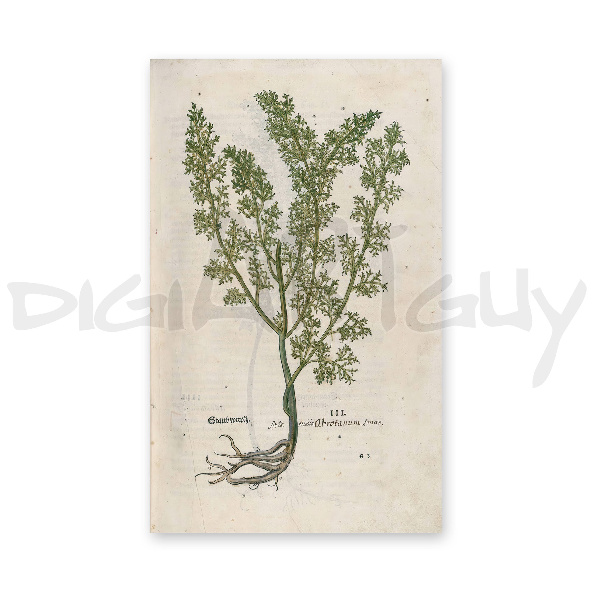 Southernwood was historically valued for its medicinal, aromatic, and insect-repelling properties, often planted in cottage gardens and used in herbal preparations and religious rituals. The Latin name Artemisia abrotanum L. appears alongside the old German name Stabwurtz, anchoring this piece in the linguistic and scientific tradition of its time.