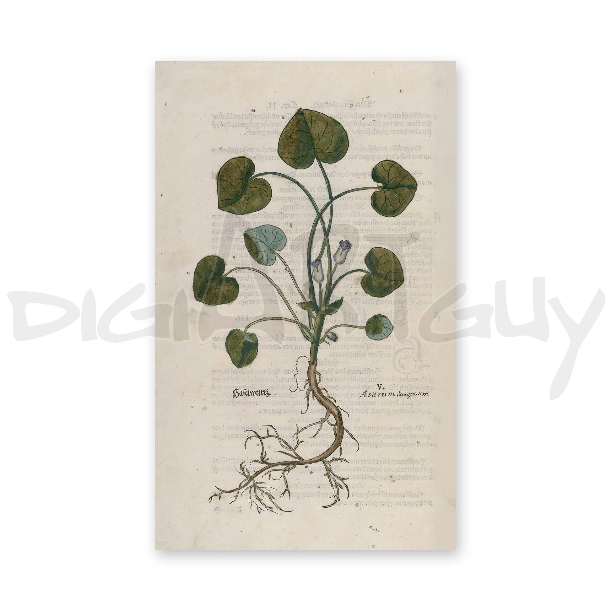 Though not a true ginger, this plant was used for its aromatic roots and medicinal properties, often in digestive and respiratory remedies. It was especially valued in medieval and Renaissance herbal traditions. Fuchs’ illustration features the Latin name Asarum europaeum and the German name Haselwurtz, rendered in the original typeface, making it both scientifically relevant and visually authentic.