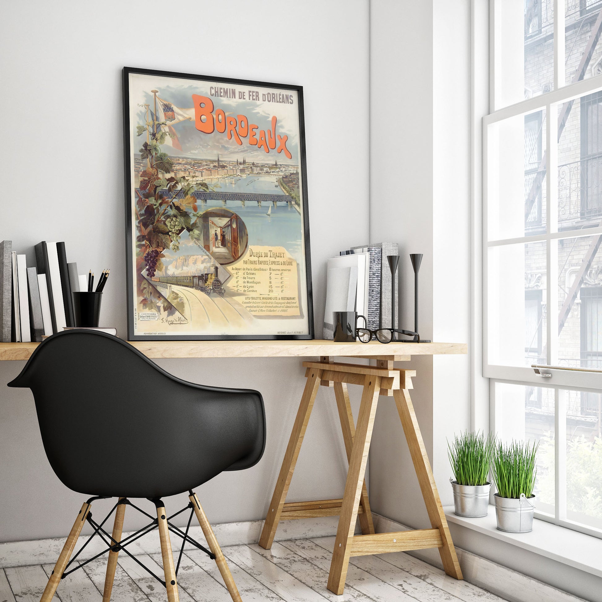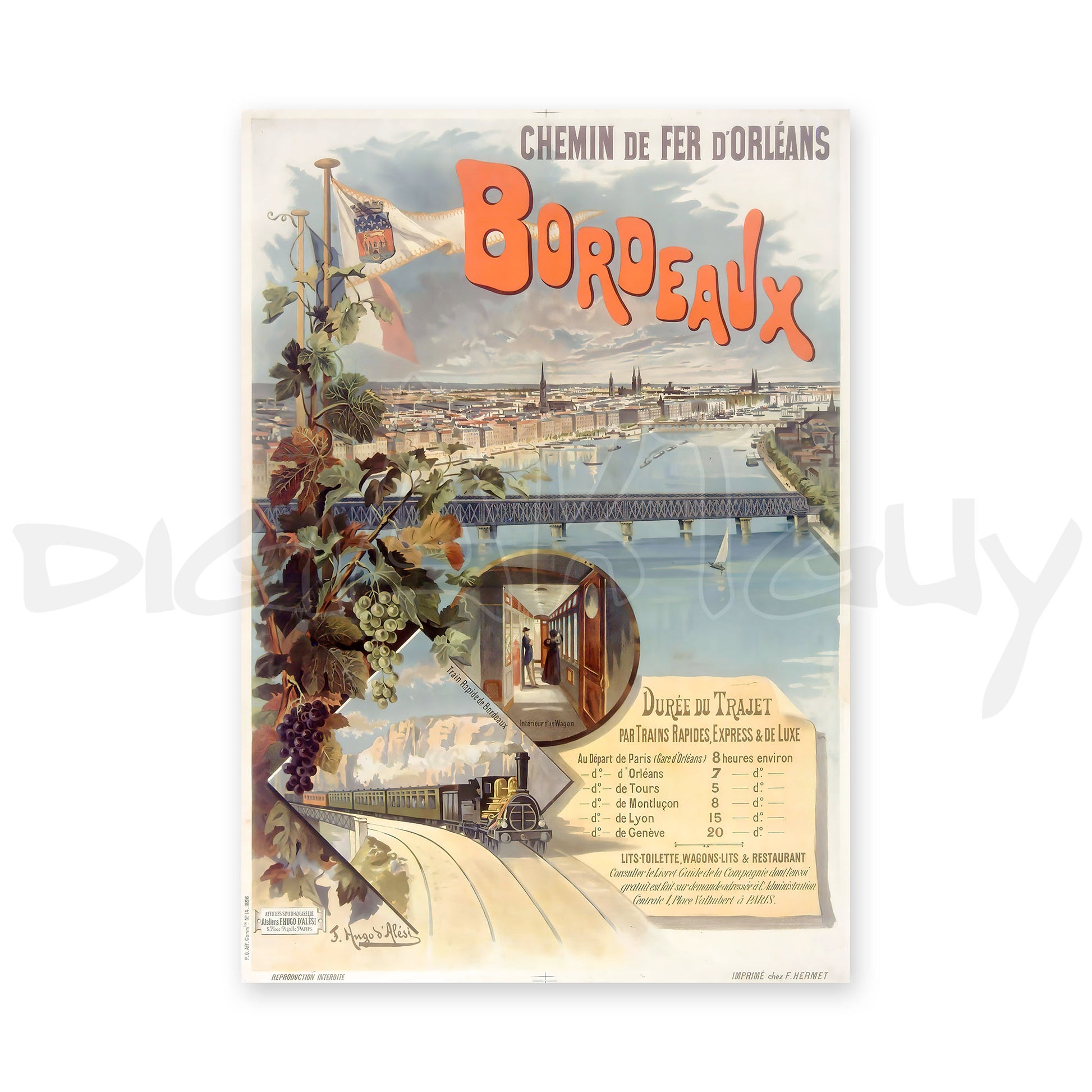 Immerse yourself in the elegance of 19th-century travel with this beautiful digital version of the vintage Chemin de Fer d'Orléans travel poster from 1897. This stunning poster showcases the rapid and luxurious train service that connected Paris and Bordeaux in approximately eight hours, a remarkable feat of the time.