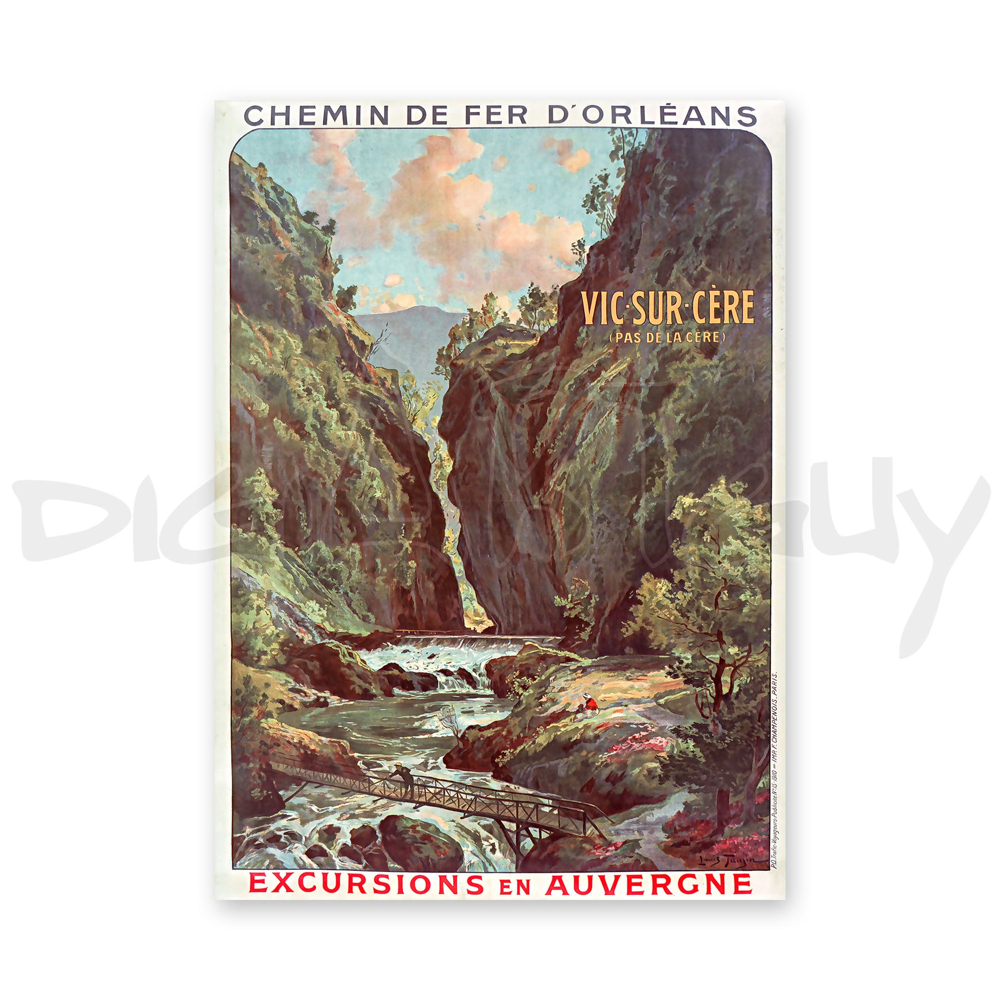 Step into the past with this stunning 1910 travel poster, originally designed to promote excursions to Vic-sur-Cère via the Chemin de Fer d'Orléans. The artwork, created by renowned artist Louis Tauzin, vividly captures the breathtaking scenery of the "Pas de la Cère" gorge in the Auvergne region of France. The dramatic rock formations and rushing river are brought to life with Tauzin's masterful use of color and detail.