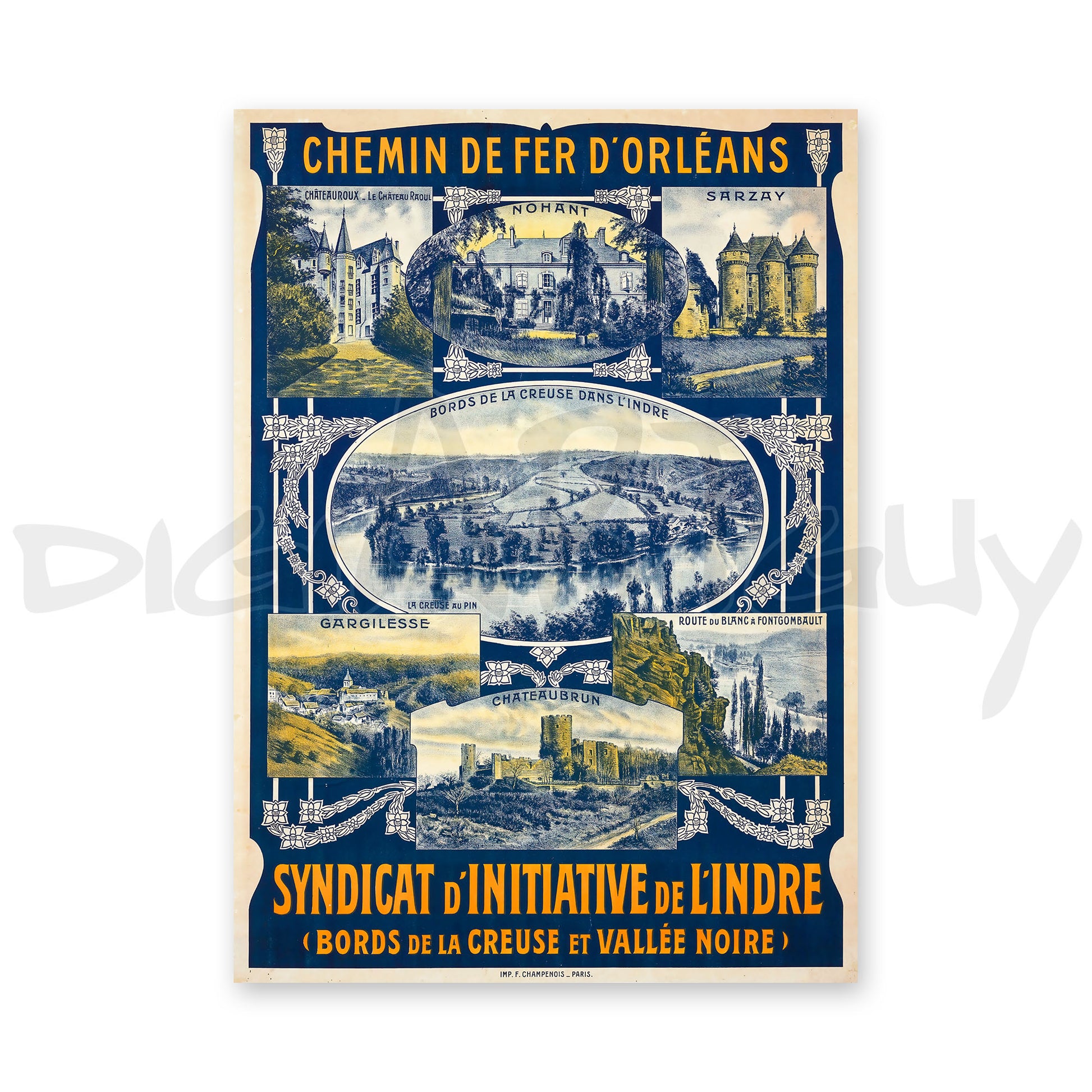 Step back in time with this beautifully vintage travel poster from 1913, showcasing the scenic beauty and historic landmarks of the Indre region in France. Originally created to promote tourism via the Chemin de Fer d'Orléans (Orleans Railway), this captivating poster highlights the charm of the "Bords de la Creuse" and "Vallée Noire" regions with exquisite illustrations of notable sites.