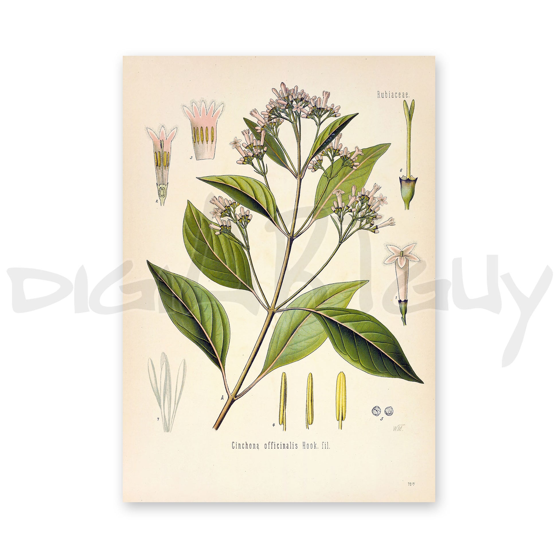 Digital image of the Cinchona bark, scientifically referred to as Cinchona officinalis, is a remarkable illustration sourced from Köhlers Medicinal Plants, or Köhlers Medizinal Pflanzen in its original language. This drawing dates back to approximately 1887.