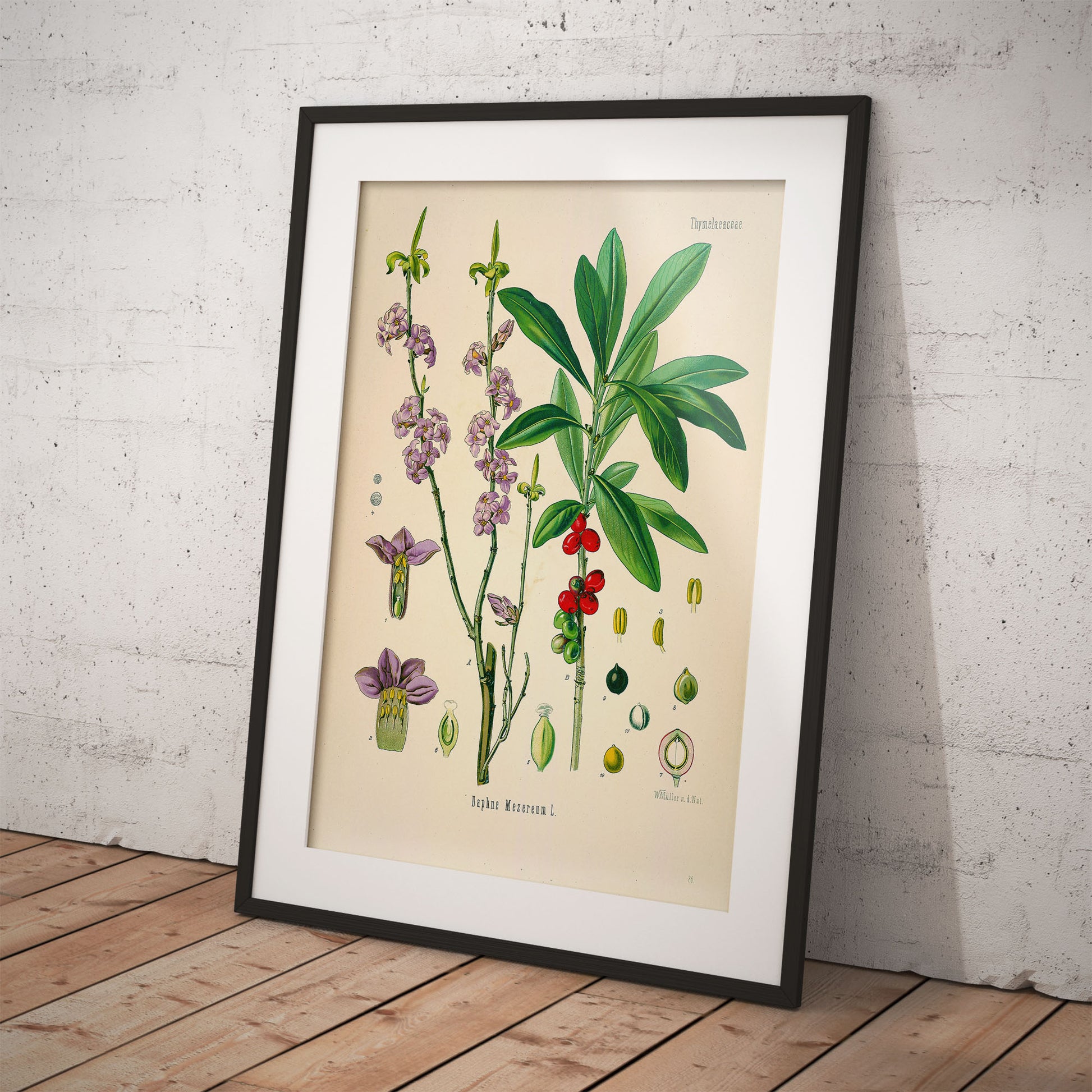 Check out this awesome digital rendering of the Daphne mezereum! It's also known as Mezereum, Mezereon, February daphne, Spurge laurel or Spurge olive. This illustration is a real masterpiece sourced from Köhlers Medicinal Plants, which is a famous collection of botanical illustrations that has been around for ages. This particular piece of art dates back to around 1887, so it's super valuable and historical.