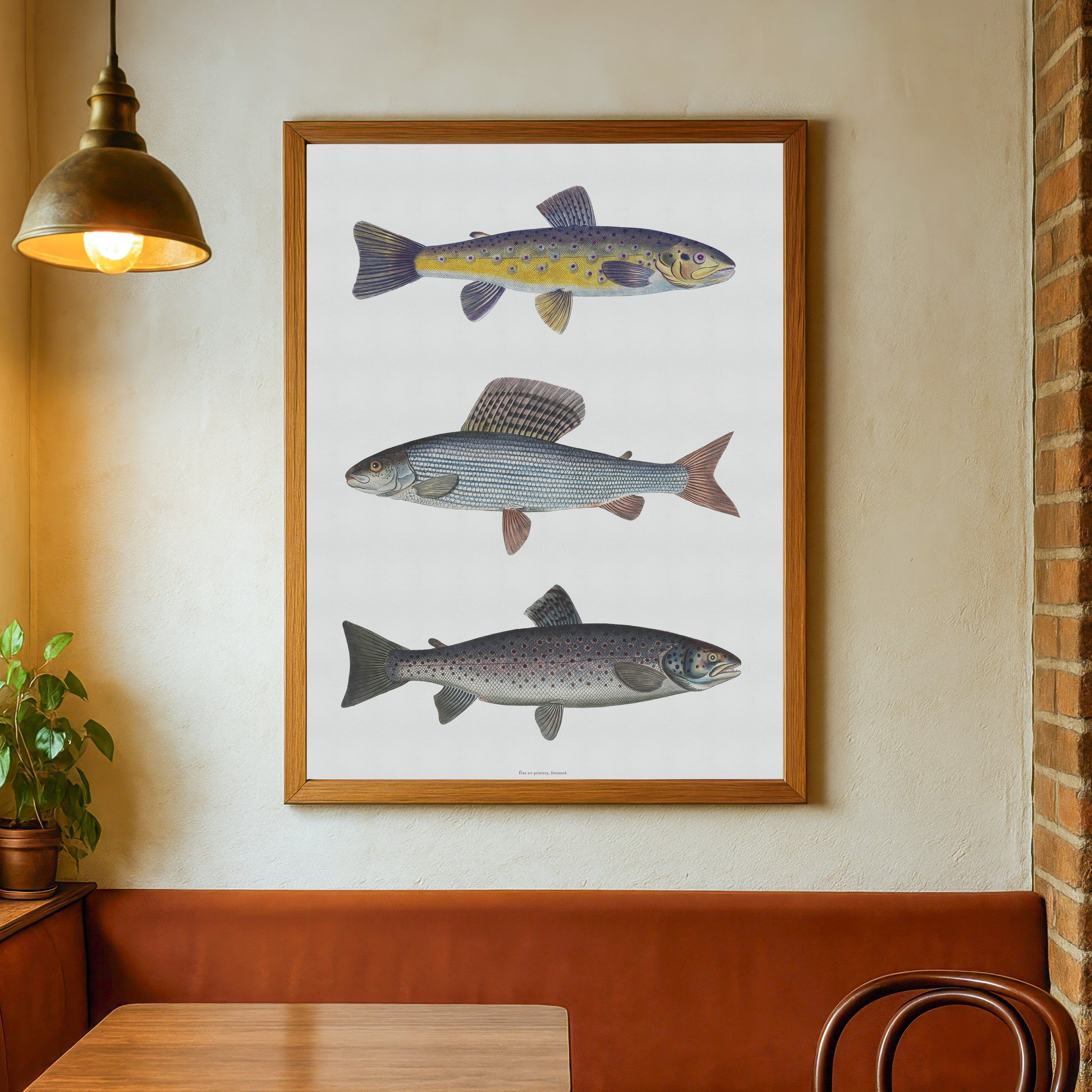 - Grayling (Salmo thymallus): A fantastic species that stands out with its large, sail-like dorsal fin, which is a focal point of this print.