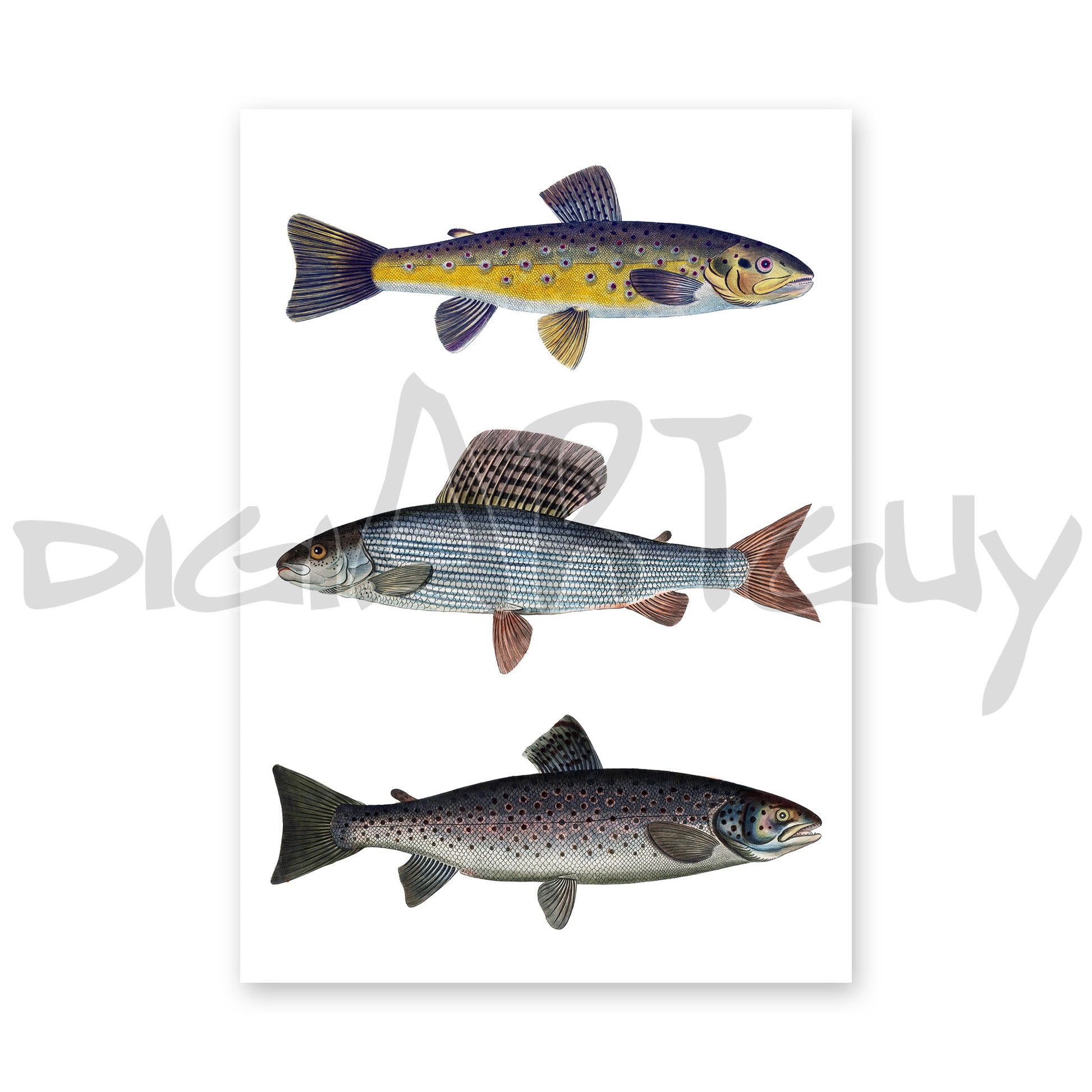 I'm offering instant access to a historical print of three iconic salmonids: the River Trout, Grayling and Brown Trout. This digital download is ideal for those who desire the freedom to print themselves and quickly create a beautiful, personalized poster. The illustrations are authentic, restored reproductions of Marcus Elieser Bloch's original copperplate engravings, created in the period 1782-1795. I've prepared this digital file to ensure it captures the original essence of the artwork.