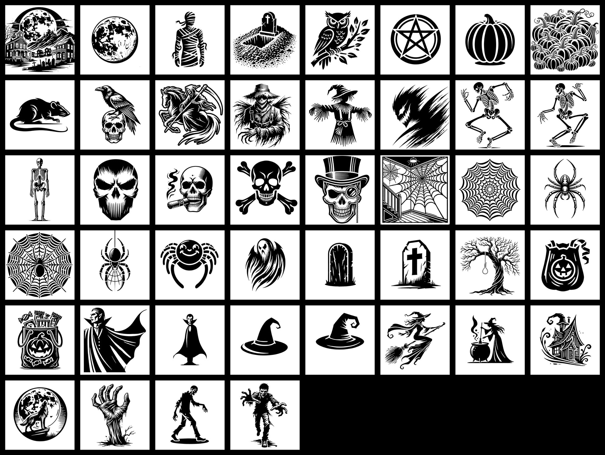 This bundle contains 176 silhouette Halloween-themed individual images, 88 in JPG, and 88 in PNG.