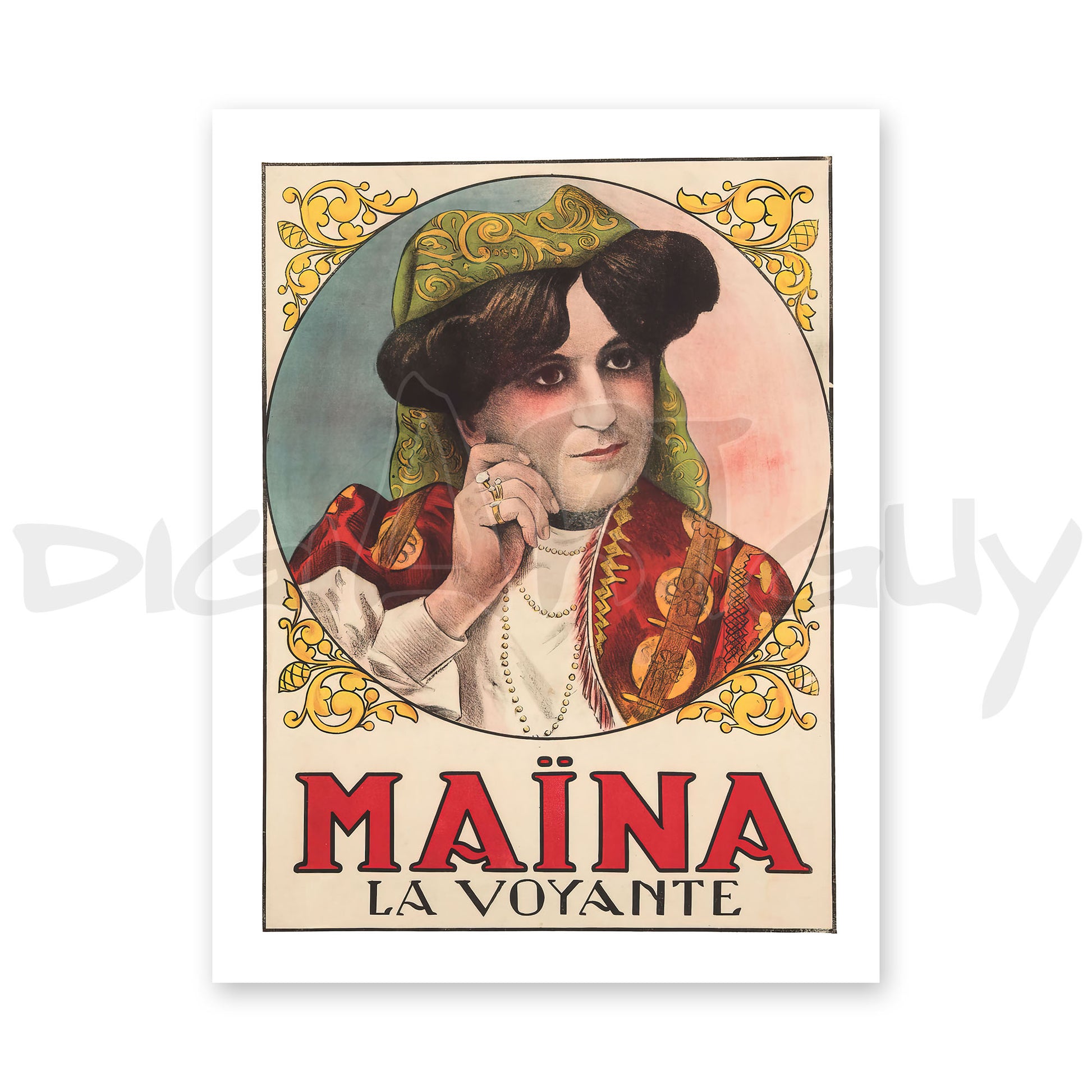 This particular poster features a portrayed depiction of Maina, a French fortune-teller who gained widespread fame during her time. The graceful and flowy nature of the illustration, combined with vivid colors and intricate detailing, reflects the organic forms that were characteristic of Art Nouveau artists. Additionally, the use of typography is noteworthy, as it adds to the overall aesthetic appeal of the design. As a collectible item, this poster holds immense historical value and serves as an excellent source for understanding and appreciating one of the most influential art movements in history.