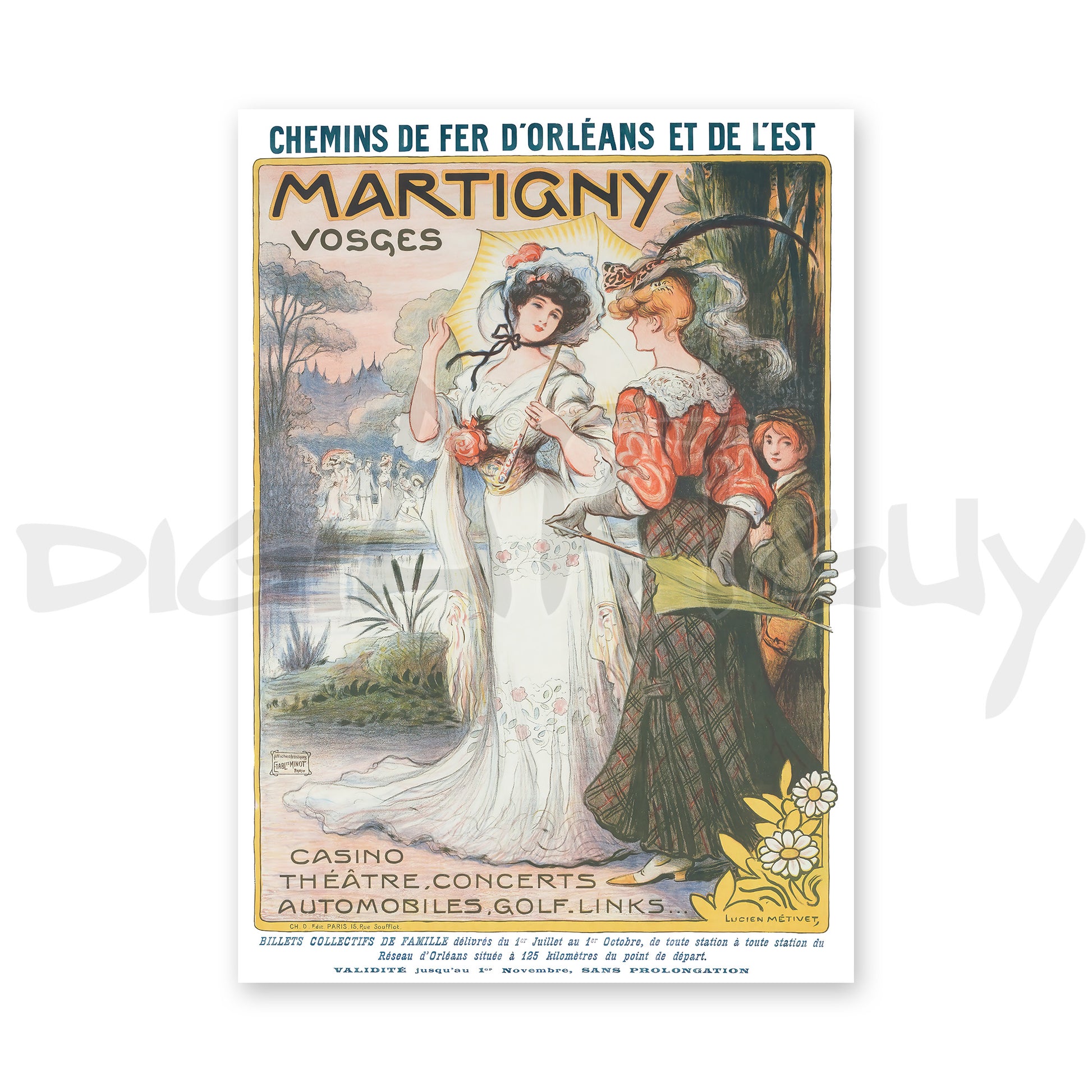Step into the charm of Belle Époque France with this elegant digital reproduction of Martigny, Vosges, a 1909 railway travel poster by celebrated French illustrator Lucien Métivet. Commissioned by the Chemins de fer d'Orléans et de l'Est (Orléans and Eastern Railways), this richly illustrated poster captures the refined leisure of a summer getaway to the spa town of Martigny in the Vosges Mountains.