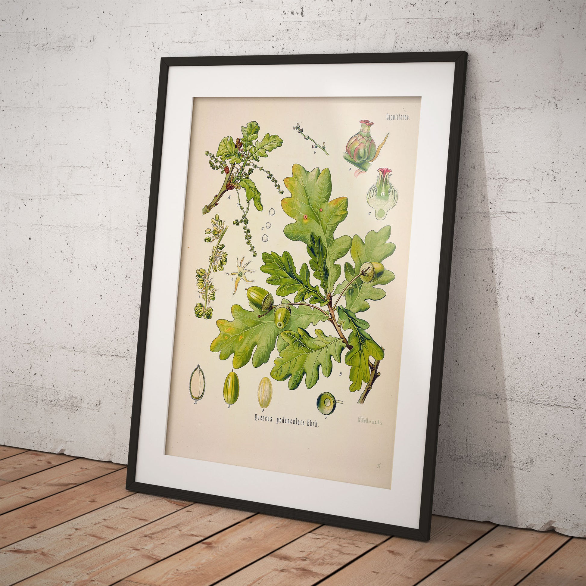 This digital image depicts Quercus robur, also known as the English oak, sourced from Köhler's Medicinal Plants of 1887. The English oak is a majestic tree that has been revered for centuries for its strength and durability. This particular image captures the intricate details of the oak's leaves and acorns, showcasing its natural beauty. Köhler's Medicinal Plants of 1887 is a renowned botanical reference book that contains detailed illustrations and descriptions of various plants, including the English oak. This digital image serves as a valuable resource for those interested in botany and the history of plant identification.