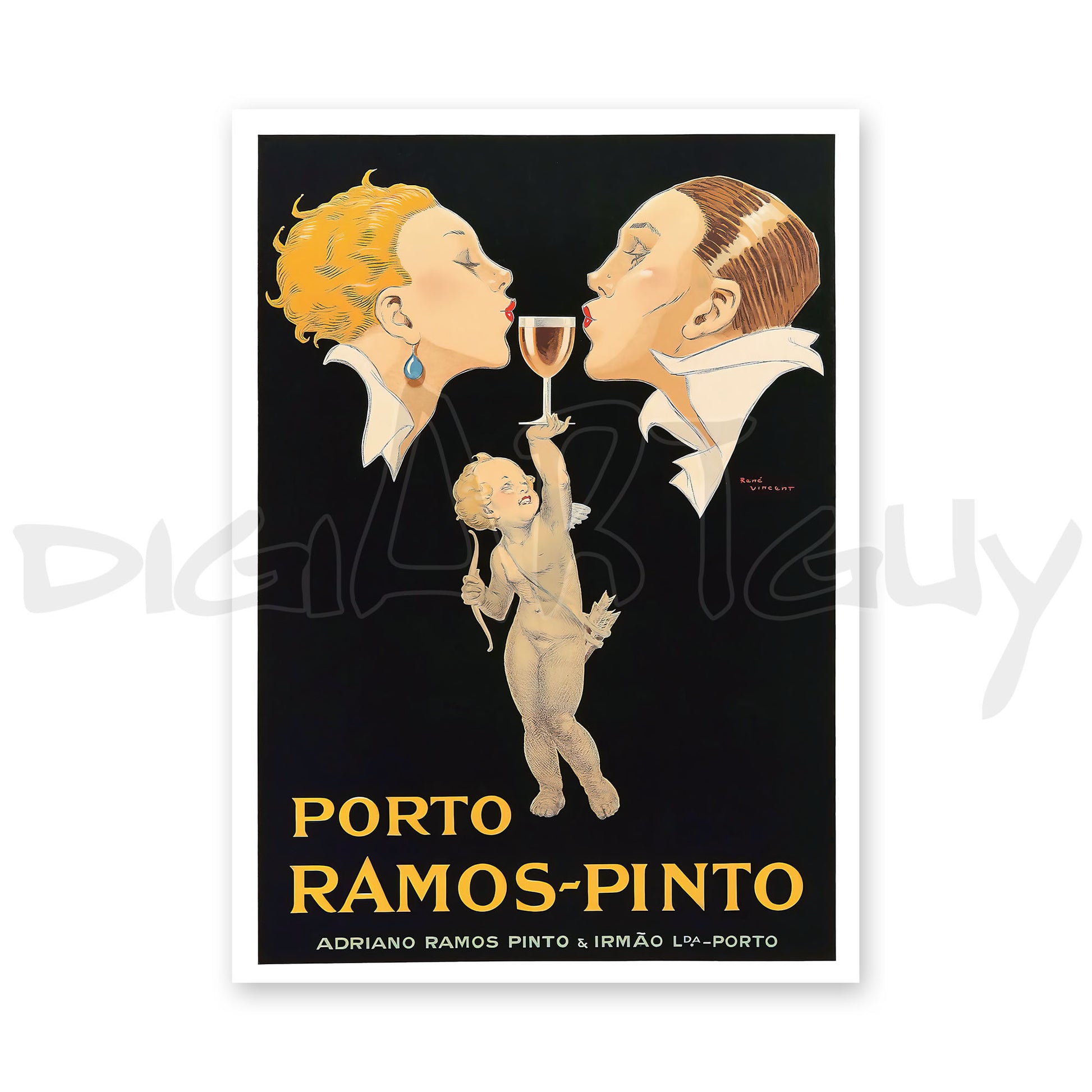René Vincent's Porto Ramos-Pinto Color lithograph is a stunning example of vintage print advertising that showcases the artistic prowess of this renowned French illustrator. The piece depicts two lovely female figures with a cupid holding a glass of port wine from Portugal's Ramos-Pinto vineyards between them. The blackness and vivid colors and intricate details of the image demonstrate Vincent's mastery of color lithography, which was a popular medium for commercial printing during the Art Deco era. The combination of bold typography and engaging imagery make this advertisement an effective tool for promoting Ramos-Pinto as a high-end brand, and its enduring popularity speaks to the timelessness and sophistication that Vincent imbued into his work. This lithograph continues to captivate viewers with its refined elegance and serves as a testament to Vincent's lasting legacy as one of France's greatest graphic designers.