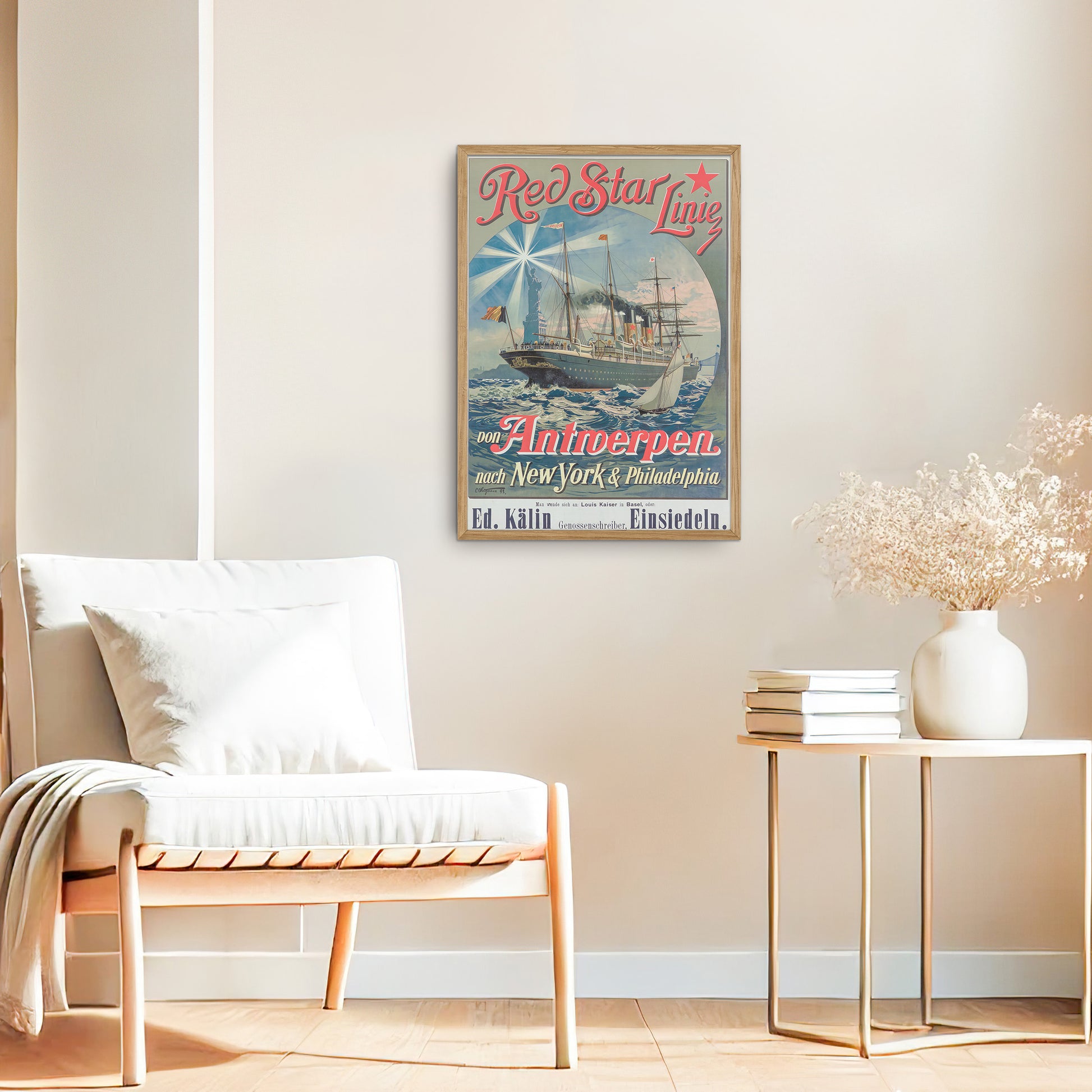 Relive the golden age of transatlantic travel with this striking digital reproduction of an original Red Star Line poster, made by Carl Saltzmann around 1893. This beautiful advertisement captures the luxury and grandeur of steamship travel, promoting voyages from Antwerp to New York and Philadelphia.