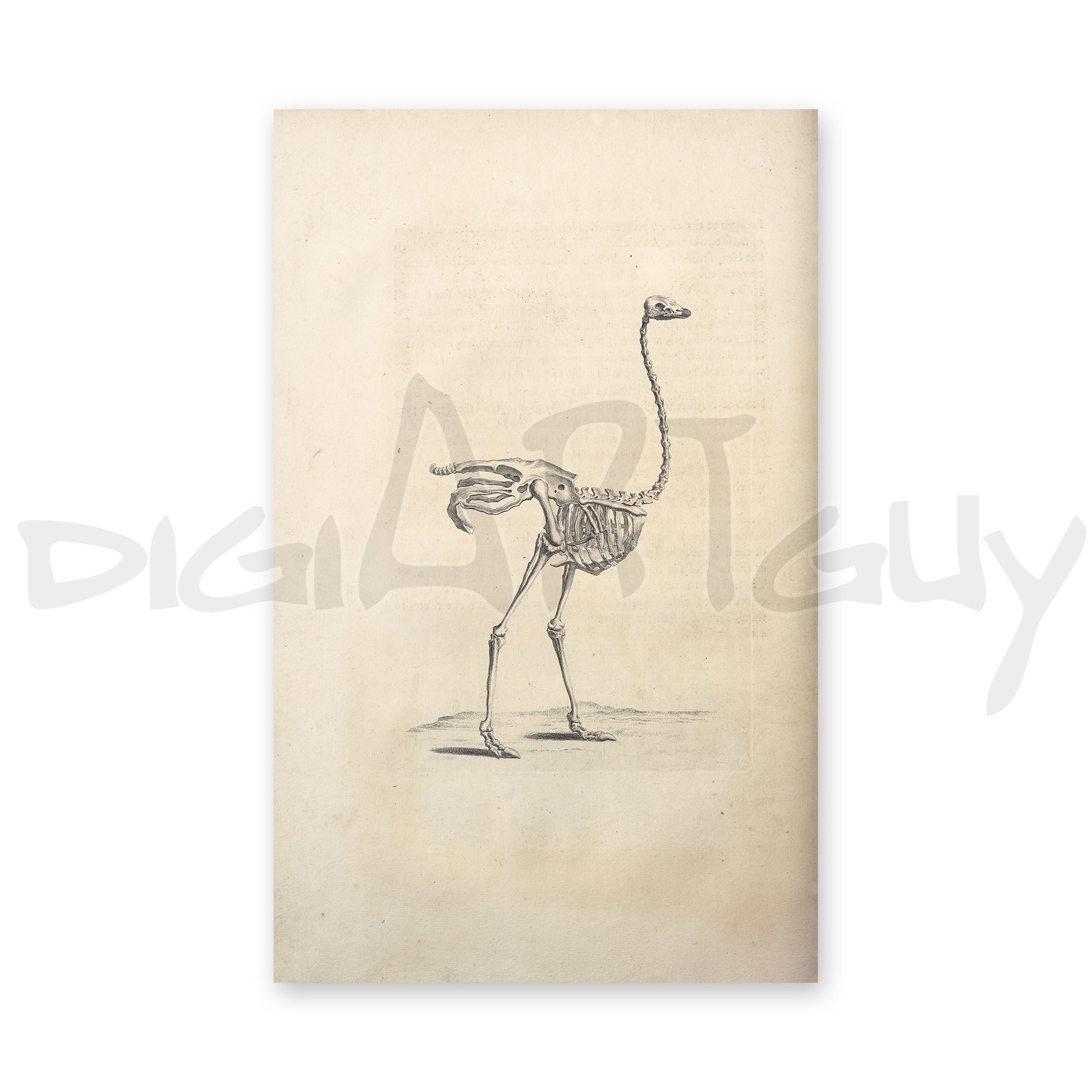 From a beautiful old book on anatomy and osteology, comes this amazing vintage illustration of an ostrich skeleton. Here it is photographed, digitally processed and enlarged, so you can print it yourself and use it as poster or in your many projects.