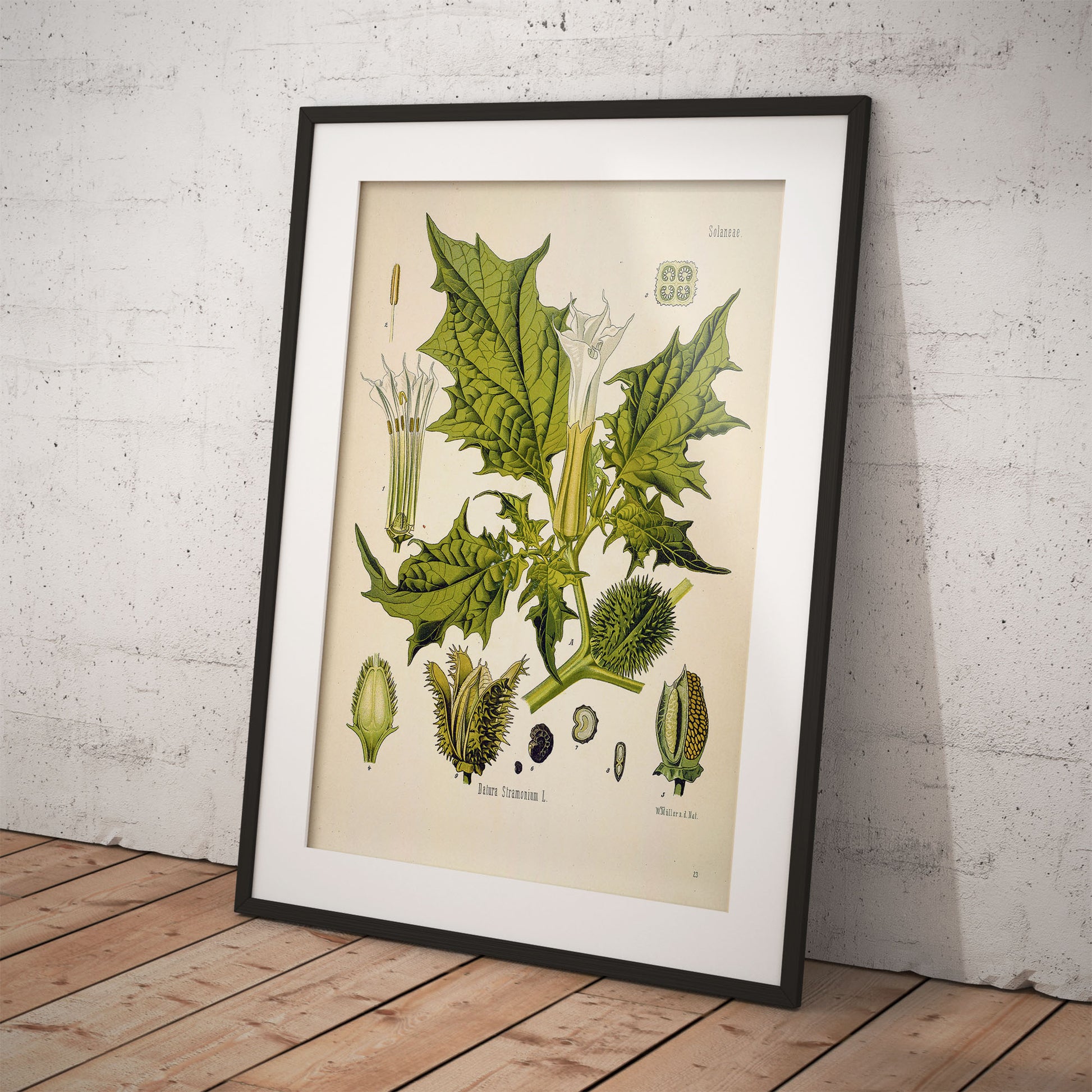 This digital rendering presents the Datura stramonium, also known as the thorn apple or jimsonweed. The illustration is a stunning masterpiece sourced from Köhlers Medicinal Plants, or Köhlers Medizinal Pflanzen in its original language. This historical botanical art dates back to around 1887, making it an invaluable piece of art.