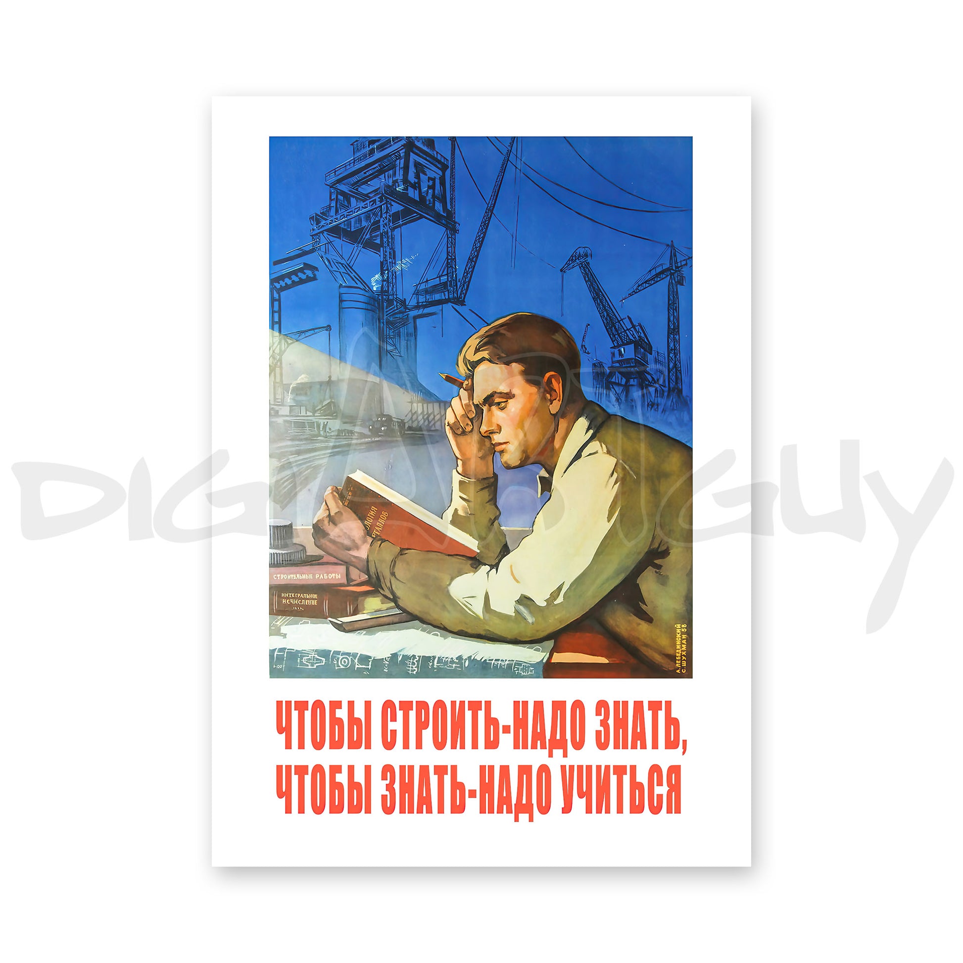 Introducing a vintage-style Russian poster from 1958 featuring a young man engrossed in reading. The text on the poster reads, "To build, you need to know. To know, you have to learn." The poster was a Russian Bolshevik propaganda poster, with the aim of generally getting people to study harder and perform better.