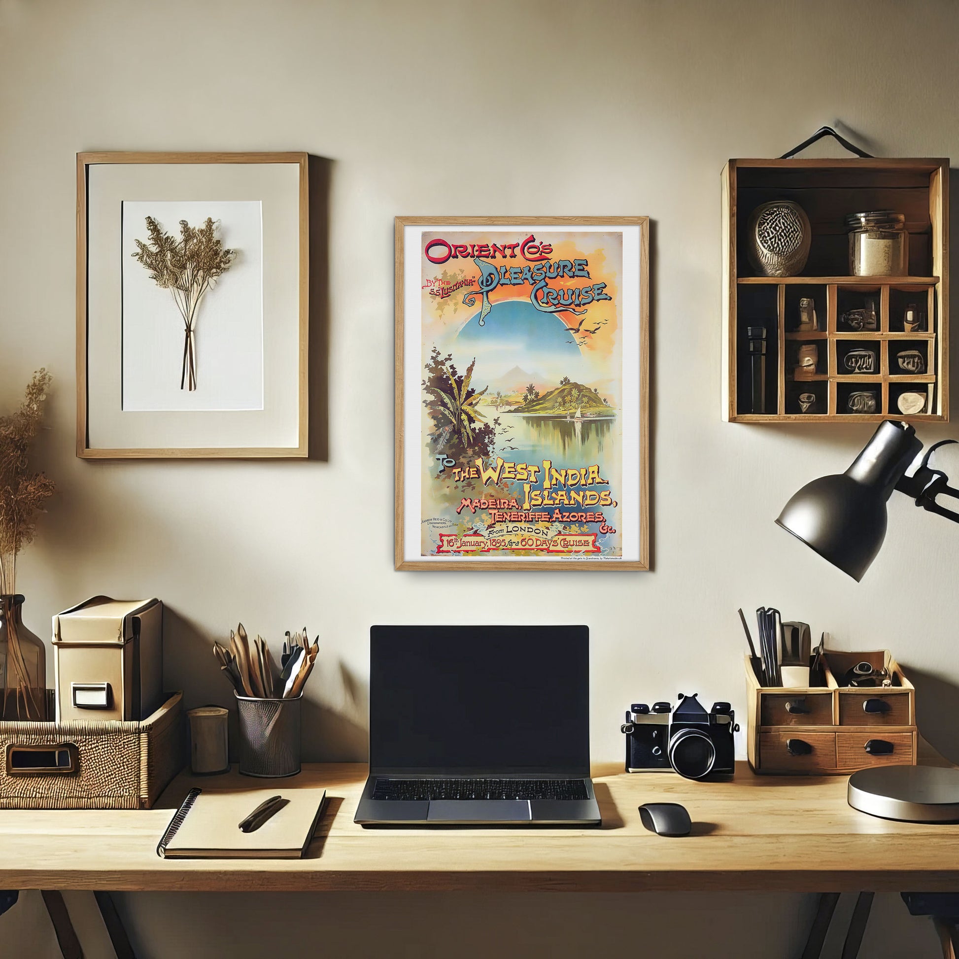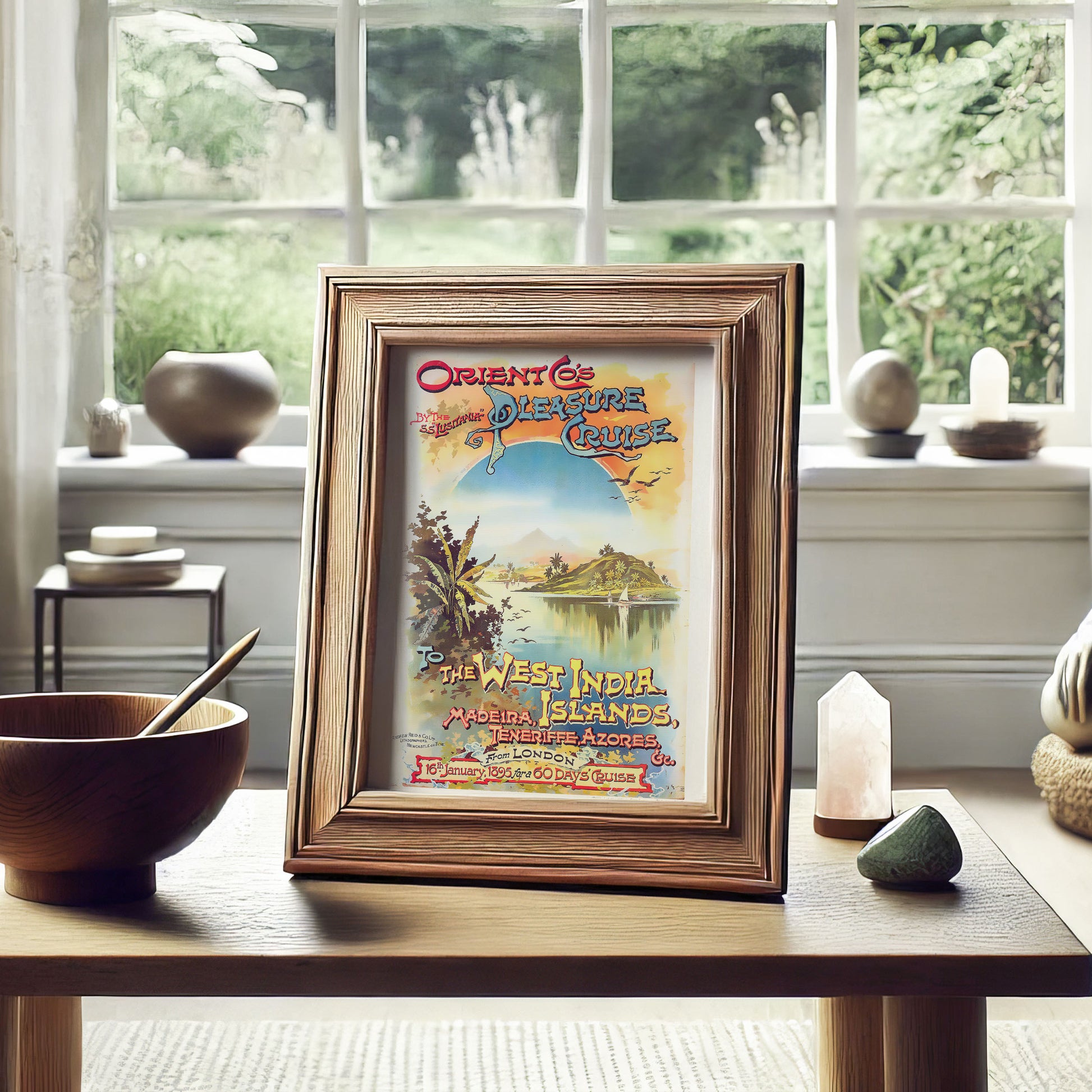To The West India Islands, Madeira, Teneriffe, Azores &c poster brings a touch of vintage elegance to any collection. Originally created to promote the Orient Line's luxurious cruise offerings, the poster advertises a delightful voyage by the SS Lusitania to the West India Islands, Madeira, Tenerife, and the Azores. The original was vibrant lithograph, printed in twelve colors, features a serene tropical landscape, enticing travelers with the promise of exotic destinations and unforgettable adventures.