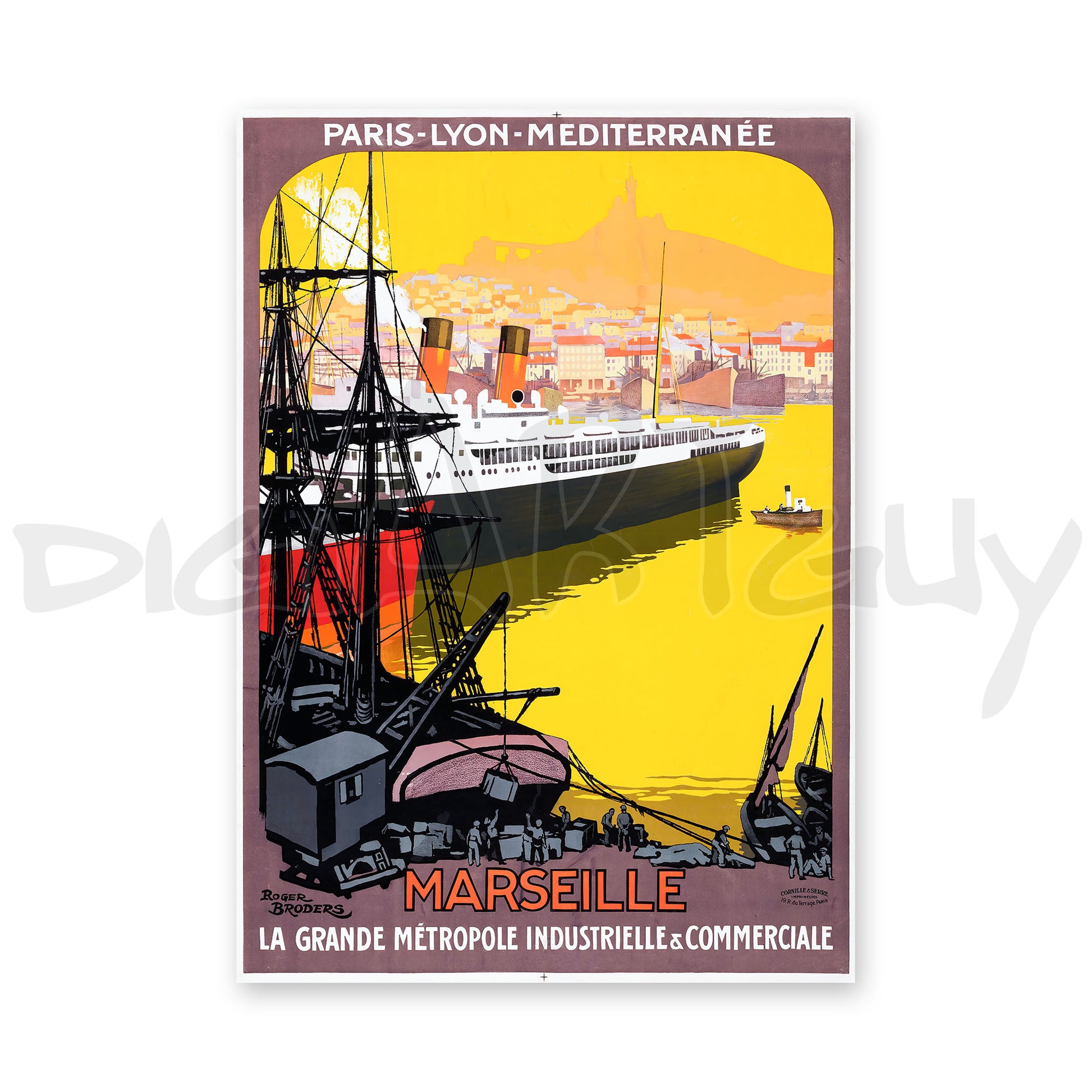 Experience the vibrant energy of 1920s Marseille with this beautiful vintage travel poster. Originally created by the artist Roger Broders, this poster promotes Marseille as "La Grande Métropole Industrielle & Commerciale" (The Great Industrial & Commercial Metropolis), highlighting its significance as a major commercial and industrial hub.